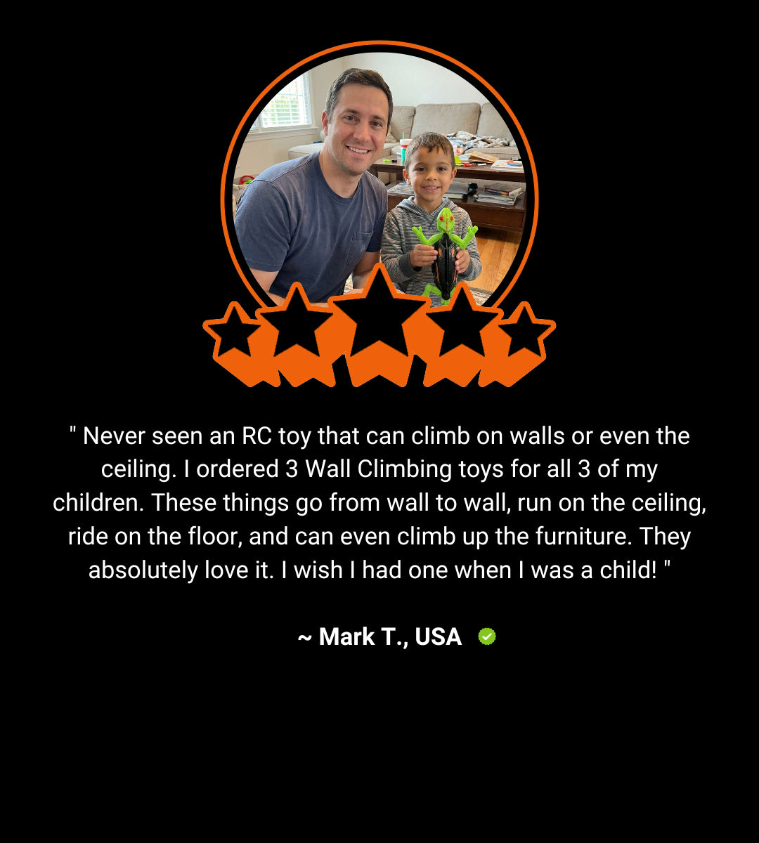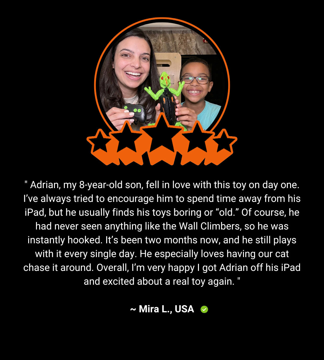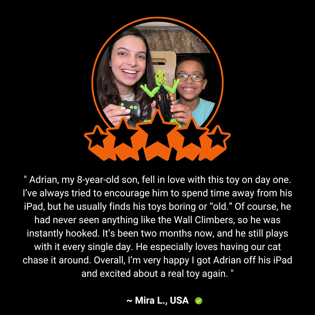 Watch it race across walls, ceilings, and floors with lifelike movement! Parents love seeing their kids' jaw drop as it defies gravity and zooms around the room. Kids chase it, race it, and never get bored of trying new tricks. It’s the only toy they won’t toss aside after a few days.
